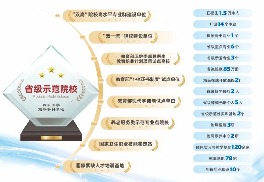 陕西省示范性高职院校、“双高”院校高水平专业群建设单位、国家“卓越医生教育培养计划”试点高校……西安医专的每一块金字招牌,都在诉说着办学的硬实力。踏入这里,你就站在了医学教育的前沿舞台。