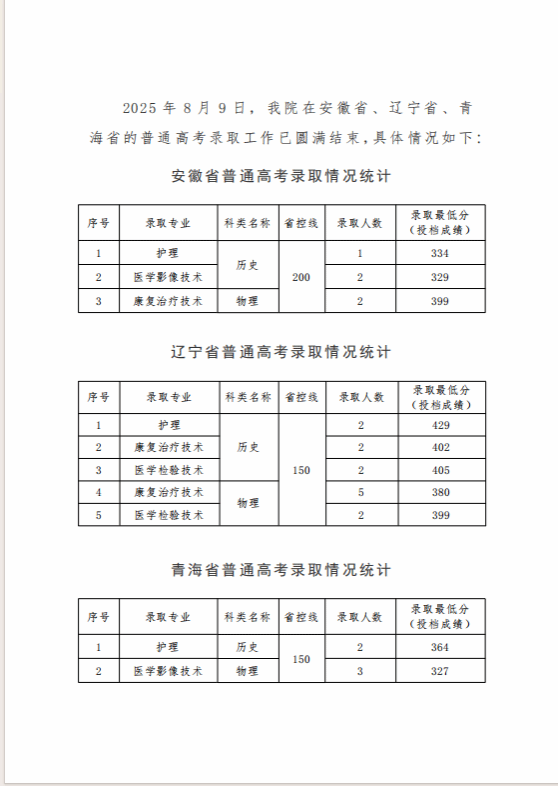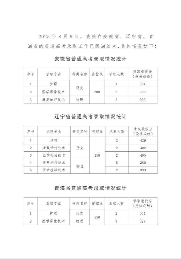 临汾职业技术学院2025年普通高考招生录取工作简报(安徽省、辽宁省、青海省)