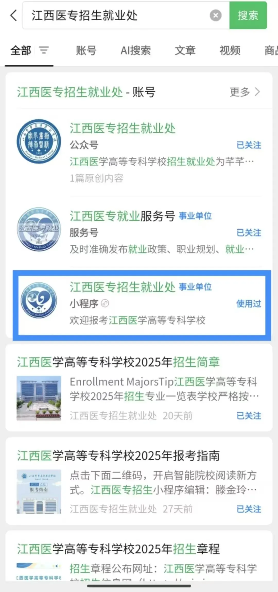1、打开微信,搜索“江西医专招生就业处”小程序,进入后点击主页面的“录取查询”即可开始查询。