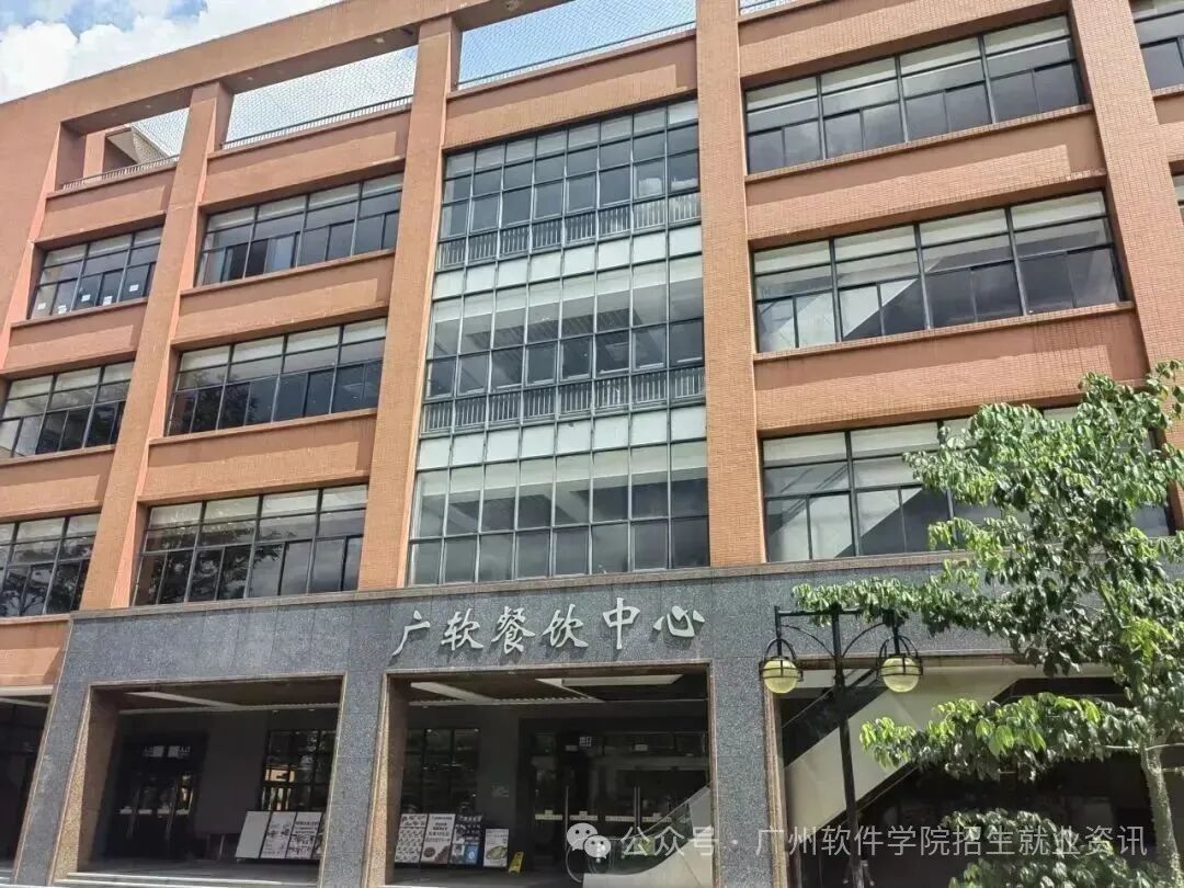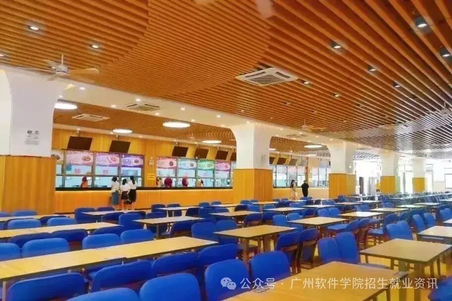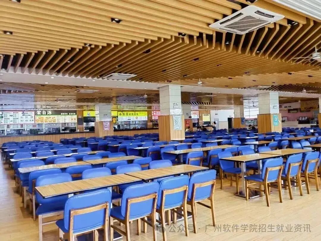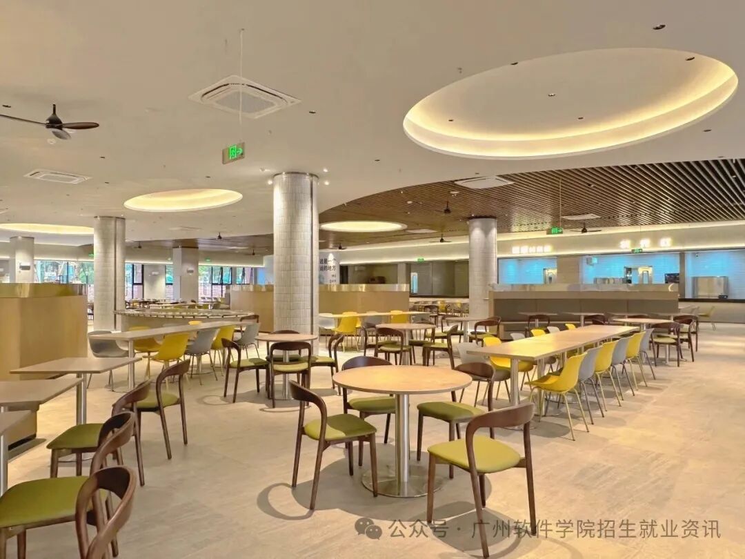 广软第二食堂位于环校东路上,广软餐饮中心与篮球场之间,毗邻女生宿舍区。学校一改传统食堂设计,旨在打造一个集美食、会友、学习、休闲、文化于一体的多功能餐厅,让新二成为学生在校园生活的第三空间。