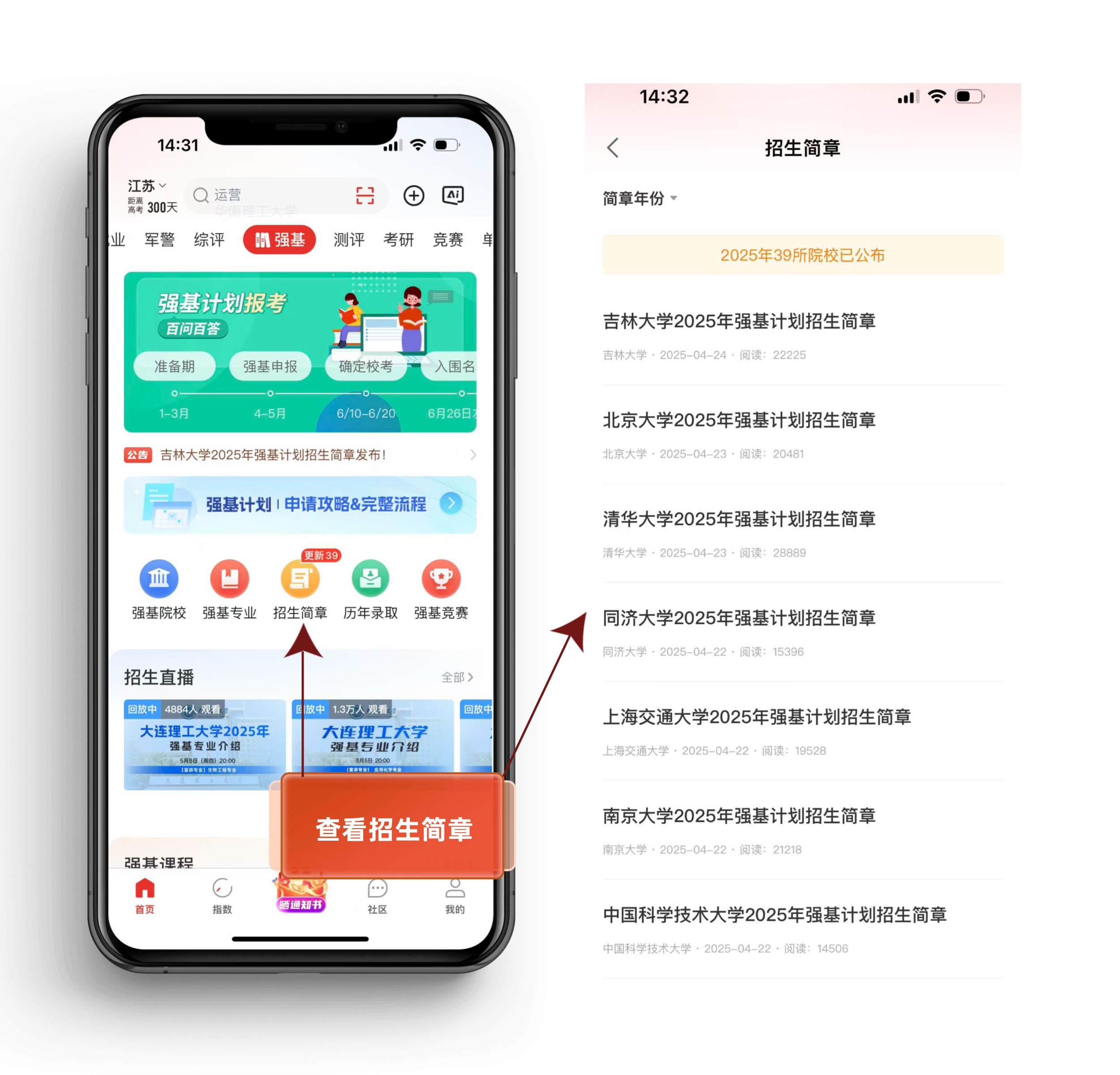 可以使用优志愿APP强基专栏,待院校公布2026年强基计划招生简章后,优志愿强基专栏会进行更新。考生可以在此直观了解到目标院校的招生人数、考试科目、校测形式、录取规则等关键信息,从而有的放矢的备考。