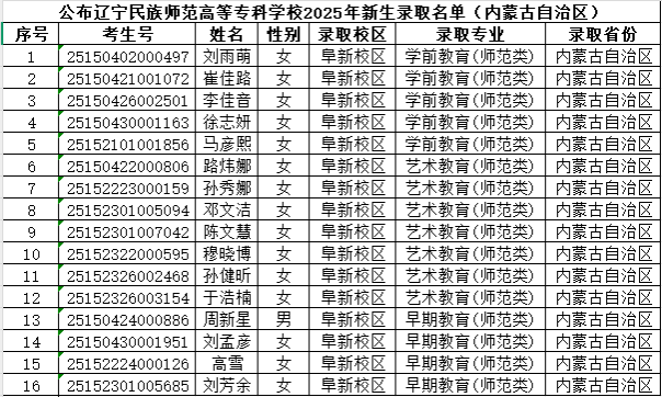 公布辽宁民族师范高等专科学校2025年新生录取名单(内蒙古自治区)