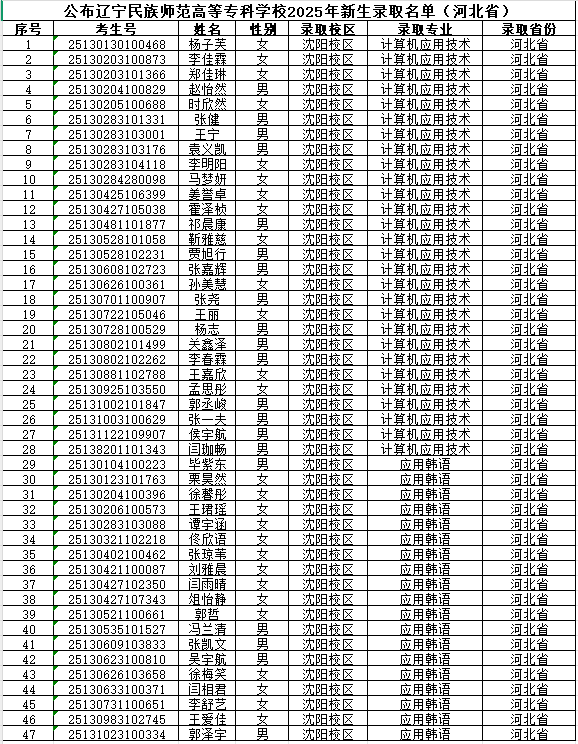 公布辽宁民族师范高等专科学校2025年新生录取名单(河北省)