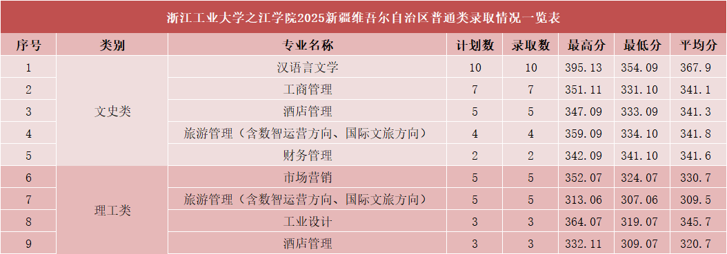 我院顺利完成2025年新疆维吾尔自治区普通类录取工作,计划招生44个,实际录取44个。其中,文史类计划招生28个,实际录取28个,最高分395.13分,最低分331.10分;理工类计划招生16个,实际录取16个,最高分364.07分,最低分307.06分。