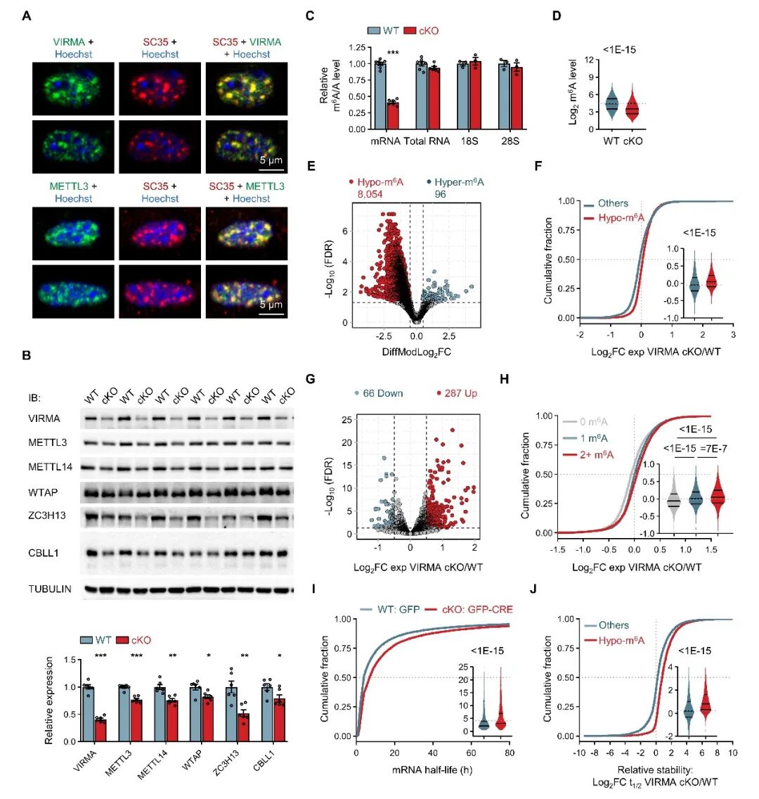 1.核心支架作用:VIRMA作为m6A甲基转移酶复合物的核心支架蛋白,其缺失导致整个复合物不稳定,使mRNA上m6A修饰水平降低60%,破坏mRNA代谢稳态(图1);