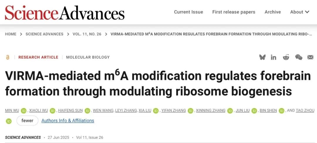 6月27日,深圳理工大学生命健康学院周涛副教授团队与南京医科大学沈彬教授团队在Science Advances发表题为“VIRMA-mediated m6A modification regulates forebrain formation through modulating ribosome biogenesis”的研究论文,首次揭示m6A甲基转移酶复合物的核心支架蛋白VIRMA通过调控核糖体生成影响大脑发育的机制。