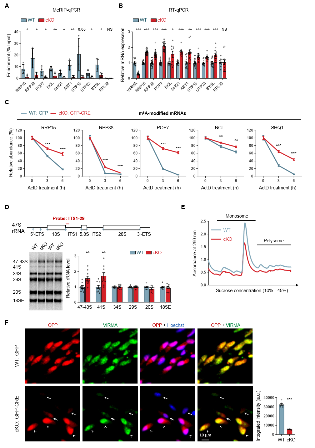 图2. VIRMA缺失通过延长核糖体生成关键因子mRNA半衰期引发核糖体生成缺陷与全局蛋白翻译抑制