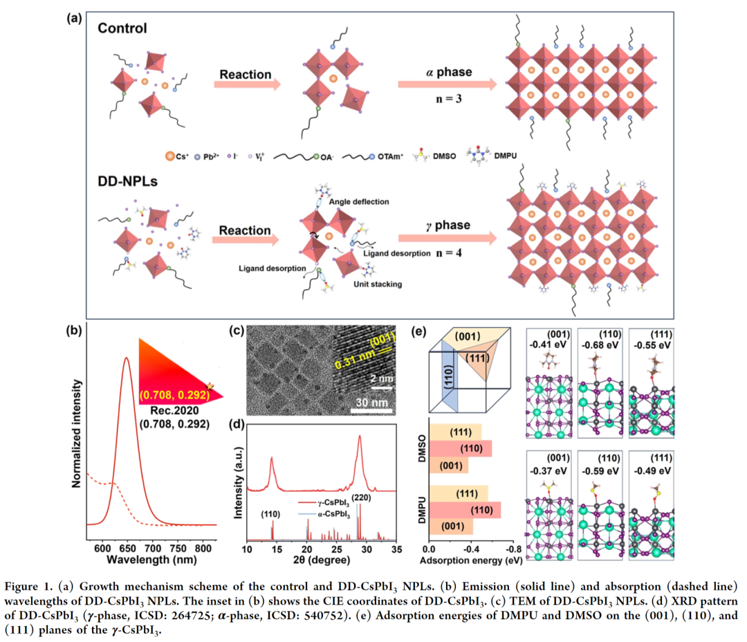 团队独辟蹊径,巧妙地利用两种特殊“分子工具”(配体)——二甲基亚砜(DMSO)和N,N’-二甲基丙烯脲(DMPU)——的有效表面配位策略,以精确调控γ-CsPbI₃ NPLs的生长。通过双配体协同效应,不仅实现了结构稳定,更有效钝化了表面缺陷,让能量高效转化为纯净红光。