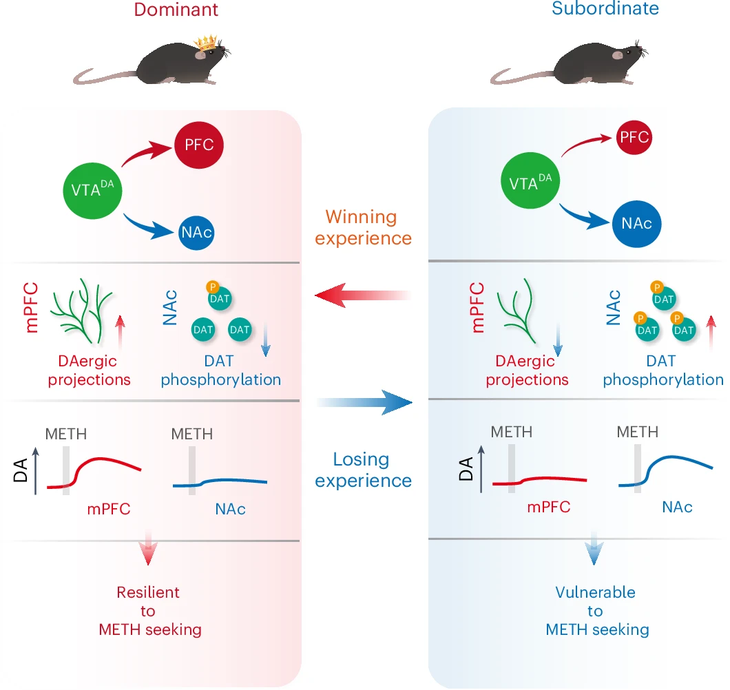为了解析该现象背后的神经机制,研究人员运用神经生物学、药理学、分子生物学、光遗传学等多种技术手段,发现社会等级通过重塑中脑皮层边缘多巴胺系统,从而调节成瘾易感性。低社会等级小鼠的中脑边缘多巴胺系统的功能更强,多巴胺合成、回收相关蛋白功能更强,多巴胺释放更多,使其更容易对毒品产生反应;而高社会等级小鼠的中脑皮层多巴胺系统功能更强大,皮层多巴胺末梢纤维更多,多巴胺释放更多,从而增强了对毒品的抵抗力。