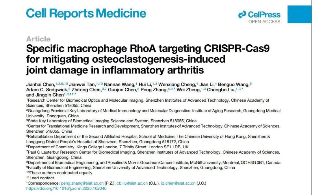 4月15日,深圳理工大学生物医学工程学院教授张鹏团队联合中国科学院深圳先进技术研究院刘成波、陈敬钦团队在Cell Reports Medicine上联合发表最新研究成果,探索炎症细胞靶向诊疗新技术,实现了类风湿关节炎滑膜巨噬细胞动态示踪与精准调控。(点击文末“阅读原文”查看论文详情)