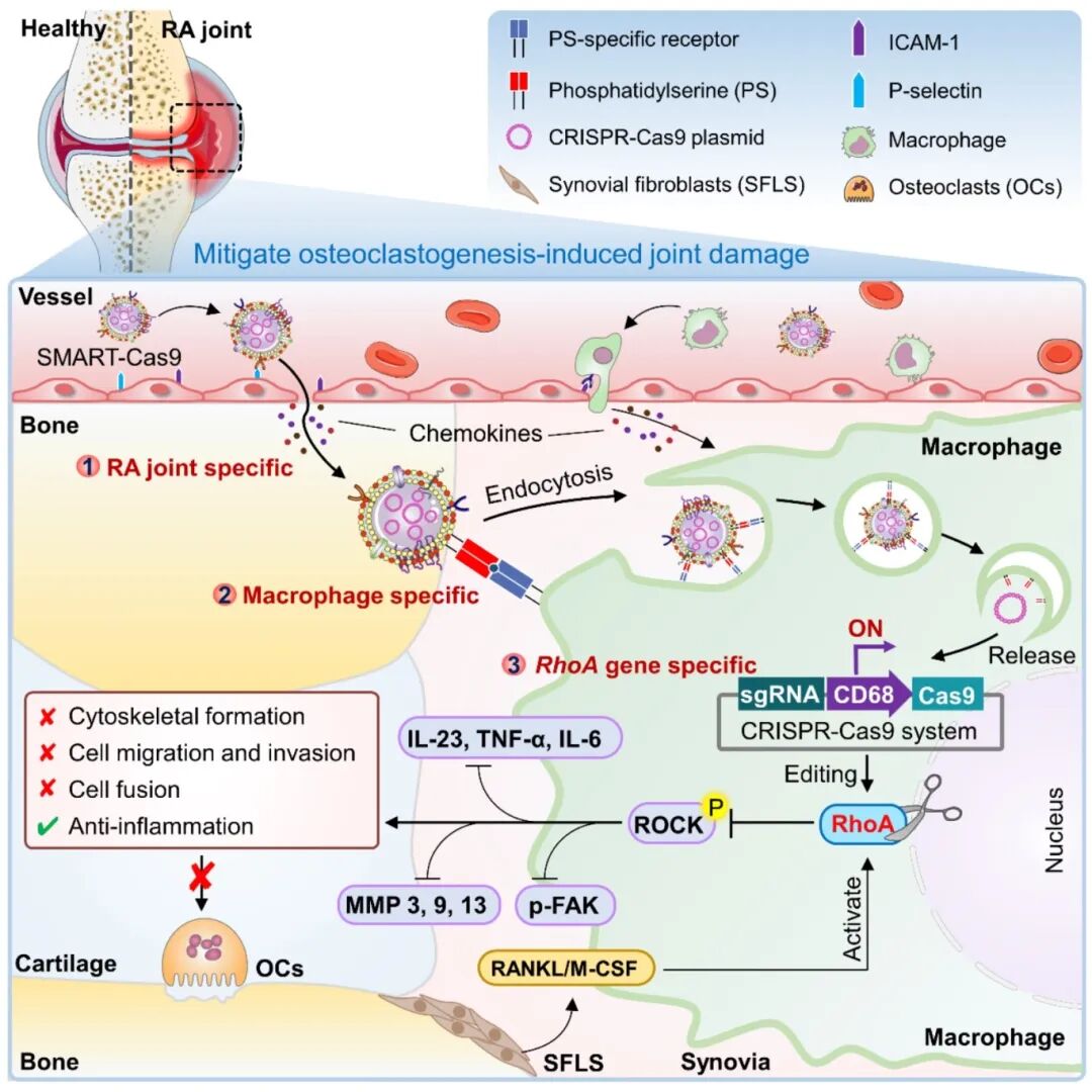 该研究验证了RhoA在调节破骨细胞生成中的重要性及其作为类风湿关节炎治疗靶点的潜力,探索了使用CRISPR-Cas9基因编辑技术通过靶向巨噬细胞中的RhoA来治疗类风湿关节炎的途径,开发了一种称为SMART的策略,使用富含磷脂酰丝氨酸(PS)的巨噬细胞膜载体(MMV)将CRISPR-Cas9靶向递送至巨噬细胞,以最小的毒性编辑RhoA。