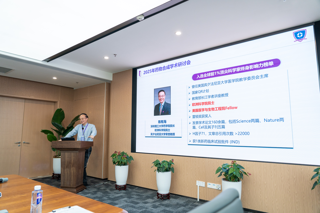 研讨会主席、深圳理工大学药学院院长、欧洲科学院院士陈有海介绍了深圳理工大学在学校建设、办学理念和人才培养等方面的情况,阐述了学校“扎根光明、服务湾区、面向世界”的办学格局。在论述天然药物合成研究时,他强调了天然药物合成研究在推动医药创新与发展中的重要地位,并介绍了药学院在AI制药方面的布局和发展情况。他特别提到,药学院今年有多个岗位正在招聘中,并向全球英才发出邀约,邀请各位嘉宾推荐优秀人才加入深圳理工大学,“深圳理工大学愿与各位携手,共同书写生物医药创新发展的新篇章!”