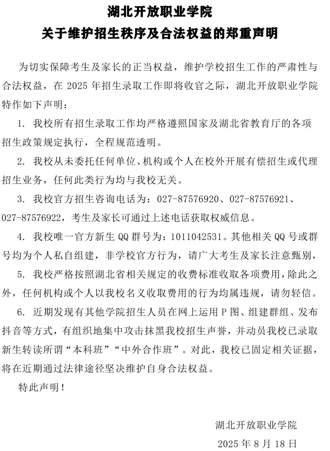 湖北开放职业学院关于维护招生秩序及合法权益的郑重声明