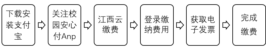 操作说明:在手机支付宝主界面上方的搜索栏里,输入“校园安心付Anp”,点击关注后,进入“江西云缴费”模块,按操作提示缴费。