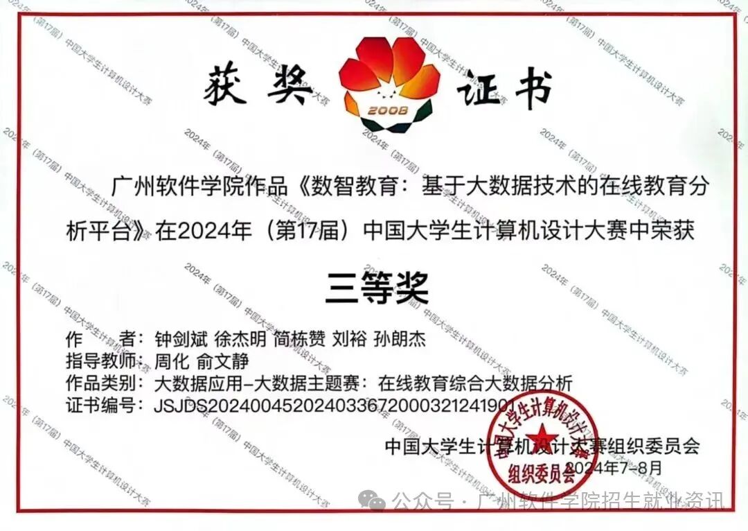 •中国大学生计算机设计大赛:网络空间安全学院(原网络技术系)学子作品《数智教育:基于大数据技术的在线教育分析平台》获国赛三等奖;《容E学智能四六级学习系统》获国赛二等奖;《慧卷通》获国赛三等奖。