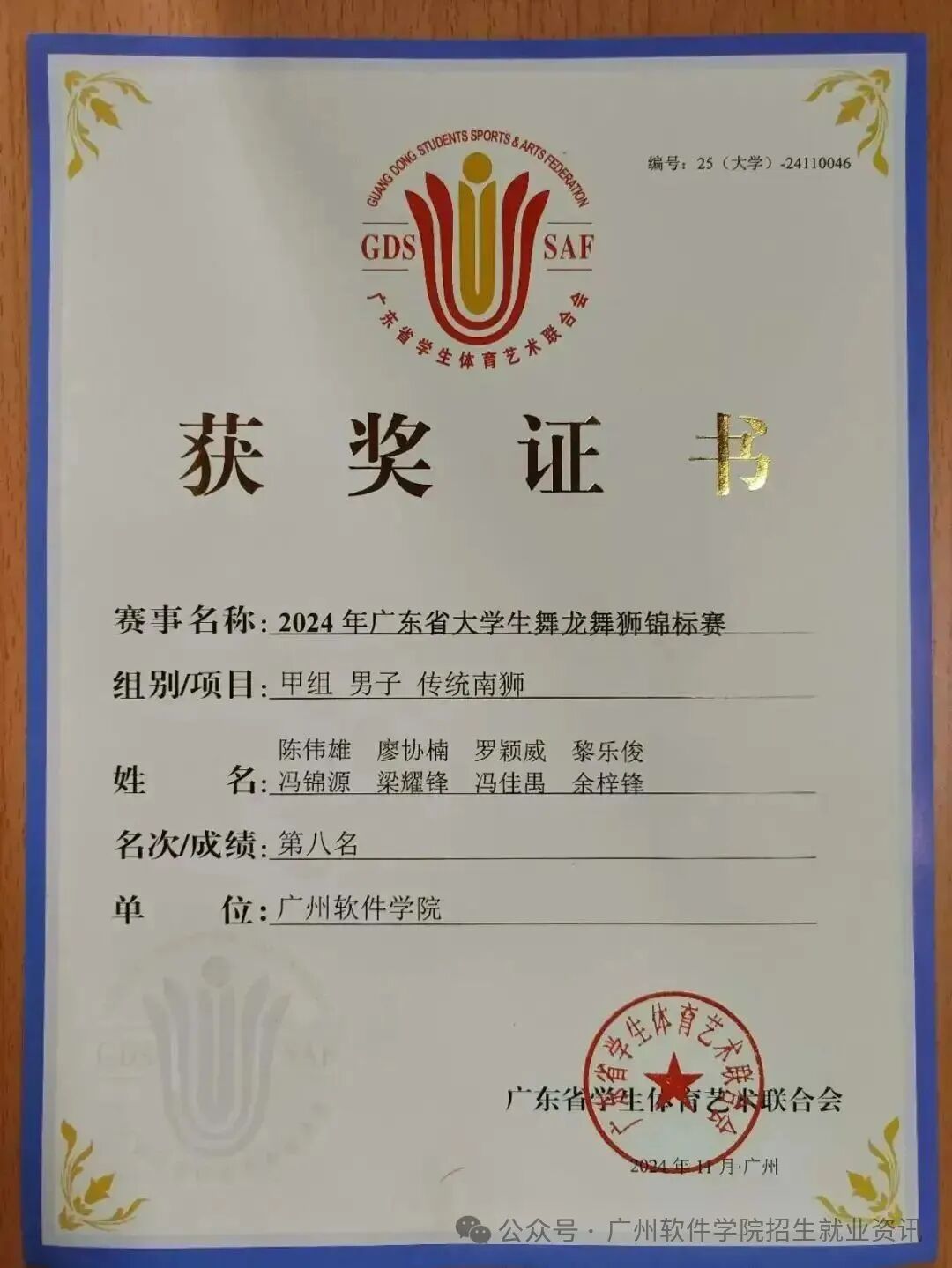•广东省大学生舞龙舞狮锦标赛:我校代表队荣获甲组男子传统南狮第八名。