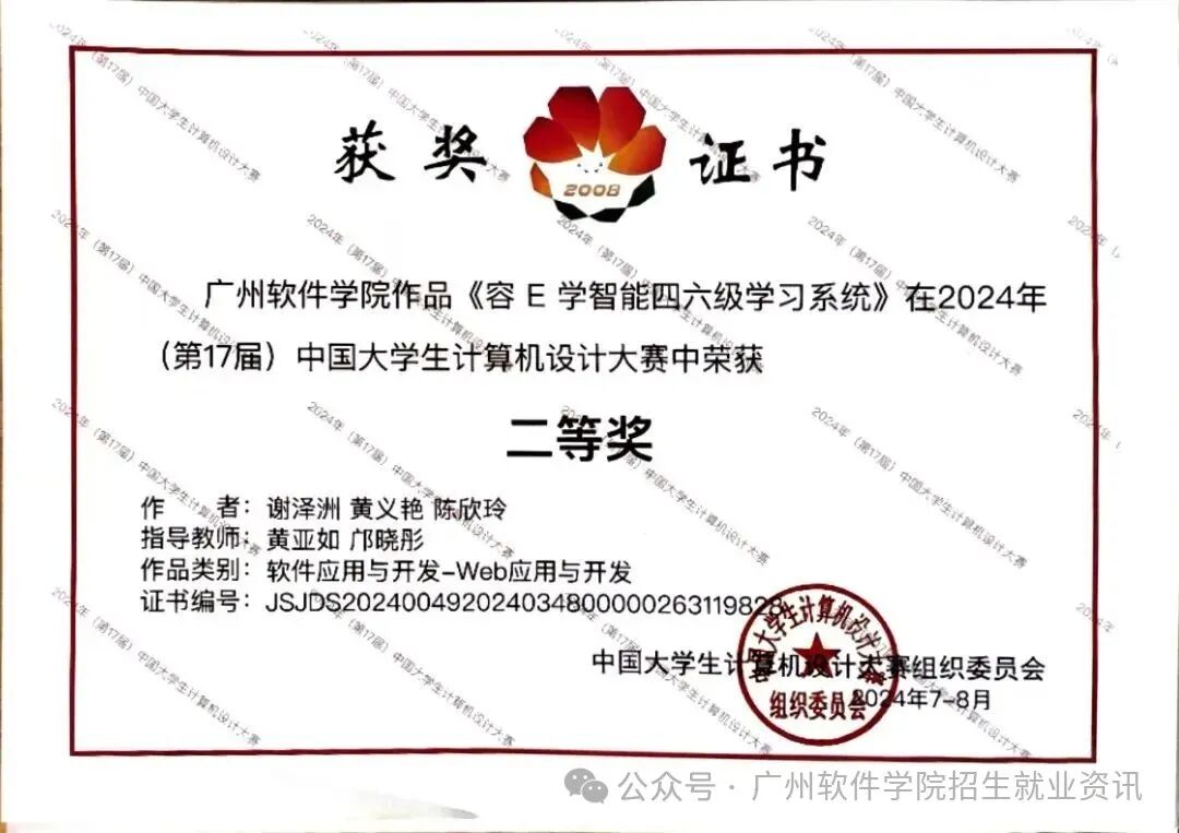 •报名时间:9月开始,各地有所不同。•考试时间:计算机二级考试每年考四次,考试时间分别是每年的三月中下旬、六月上旬、九月中下旬、12月上旬。•广软优势:作为一所软件学院,我校学生在计算机应用和设计方面表现卓越。例如,网络空间安全学院(原网络技术系)学子在第17届中国大学生计算机设计大赛国赛中荣获三等奖;创意设计学院(原数码媒体系)学子在全国高校数字艺术设计大赛 (NCDA) 中屡获佳绩,包括全国总决赛一等奖。