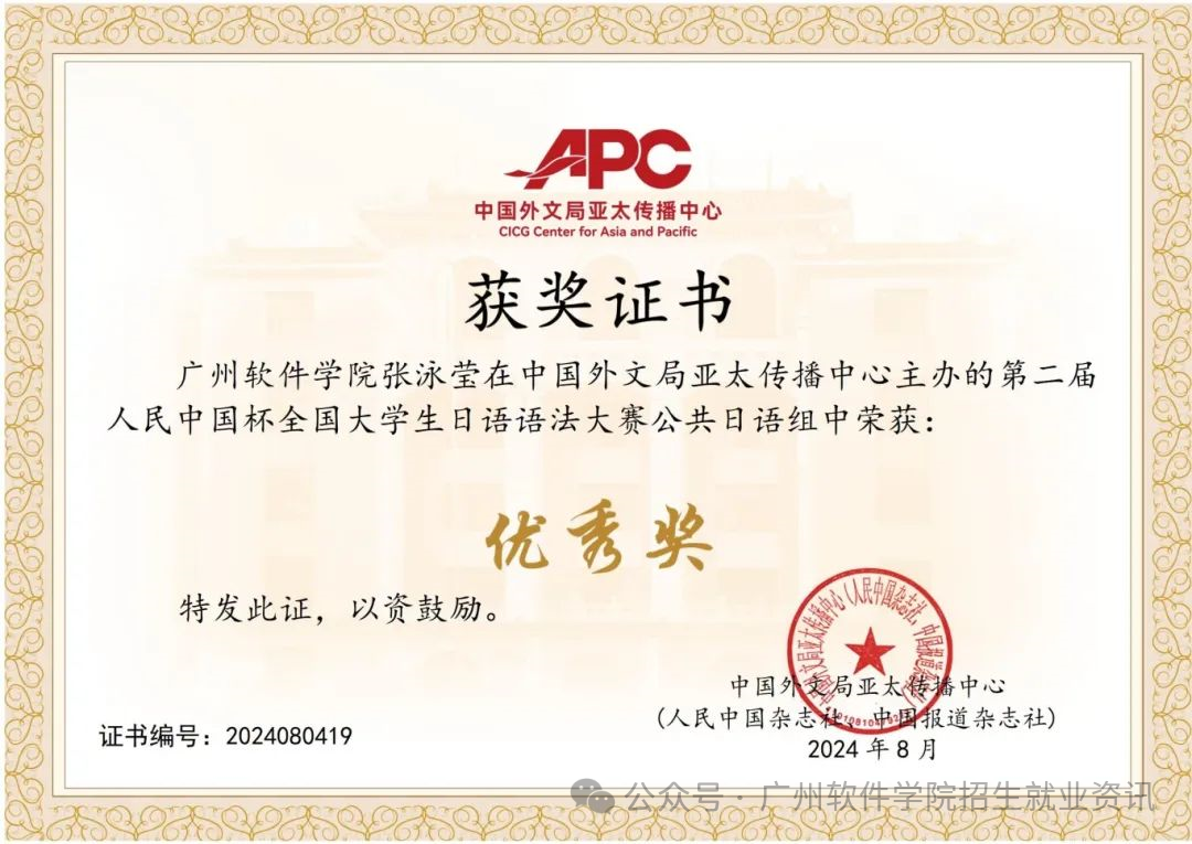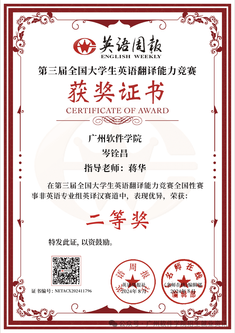 •广软风采:我校学子在各类语言竞赛中表现突出。我校软件与人工智能学院(原软件工程系)2022级数据科学与大数据技术2班的李锦航获第七届全国高校大学日语演讲比赛全国决赛一等奖。外国语学院(原外语系)王艳华、佐藤克也(SATO, KATSUYA)两位老师被评为“优秀指导教师”。我校2024级电子与计算机工程专业的李泽锋(指导老师:冯保玲)与2024级物流管理专业的李安琪同学(指导老师:陈鹏机)荣获第三届“燕兴杯”大学生英语应用能力竞赛复赛三等奖。我校软件与人工智能学院(原软件工程系)张泳莹同学荣获第二届人民中国杯全国大学生日语词汇大赛优秀奖。我校岑铨昌同学在第三届《英语周报》全国大学生英语翻译能力竞赛表现优异,荣获二等奖。