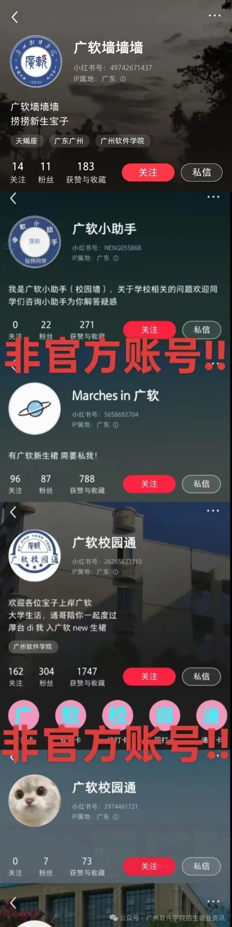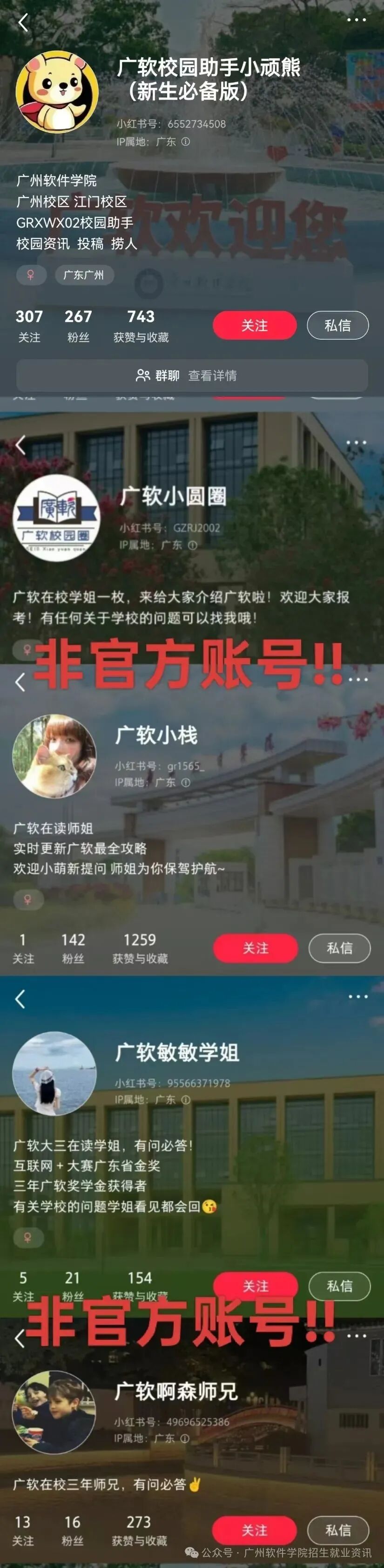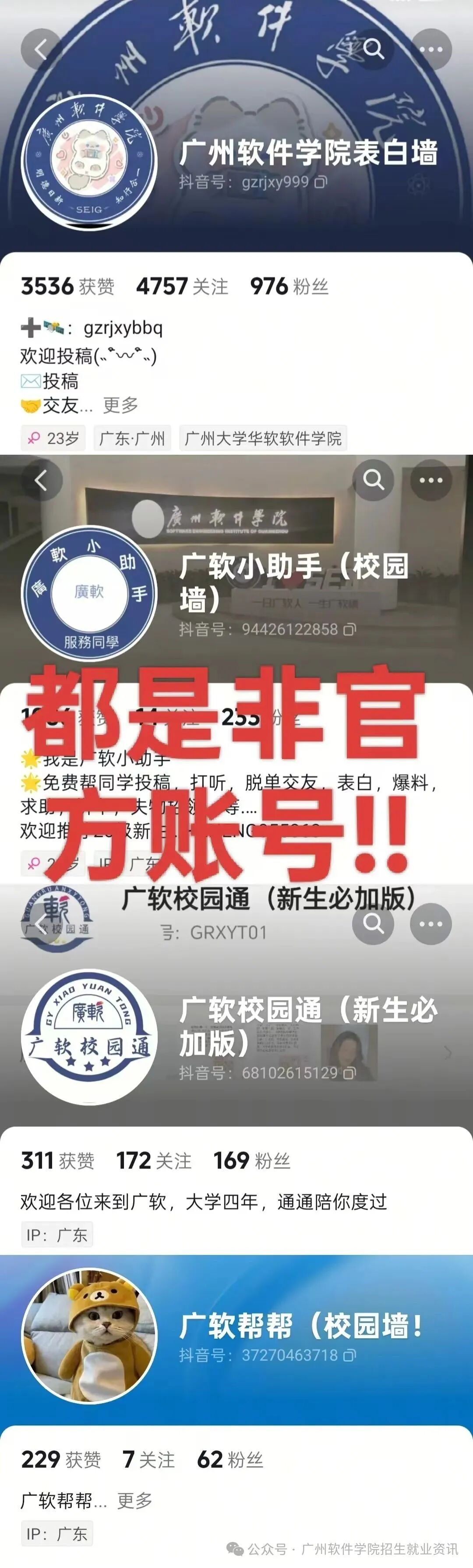 近期,我们发现在微信、QQ、抖音、小红书等社交媒体平台出现多个以“广州软件学院XXX”“广州软件学院X老师”“广软X老师”“广软XX”等命名的非官方账号,以及“广州软件学院新生交流群”等群组。上述账号/群组未经学校授权,擅自使用“广州软件学院”校名(包括但不限于中英文全称、简称)、校徽等官方标识作为头像、名称误导关注,或假借学校、学院部门名义发布各类校园资讯及通知信息,或伪装成学长学姐,用虚假通知、内部信息、“一手”资料、兼职交友、赠送文创礼品等形式“引流”,推销手机卡等商品“圈钱”,甚至套取个人资料信息,给大家的安全埋雷。