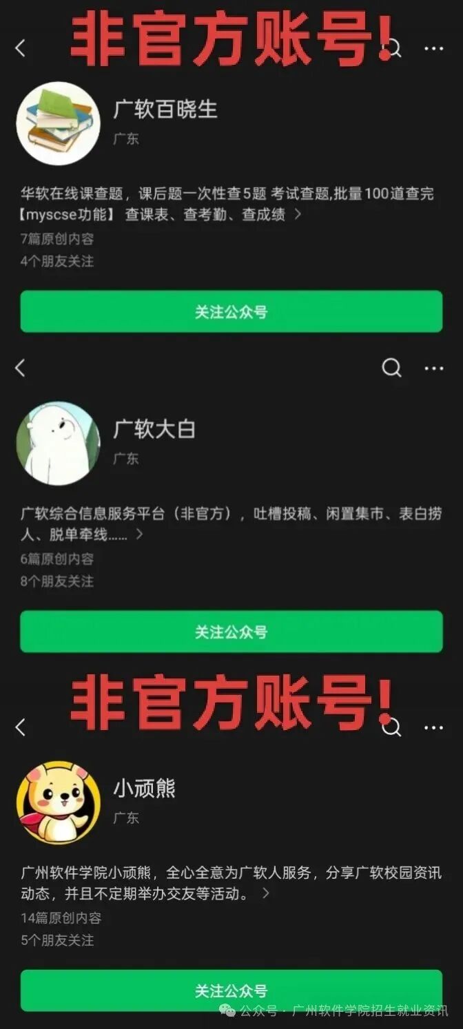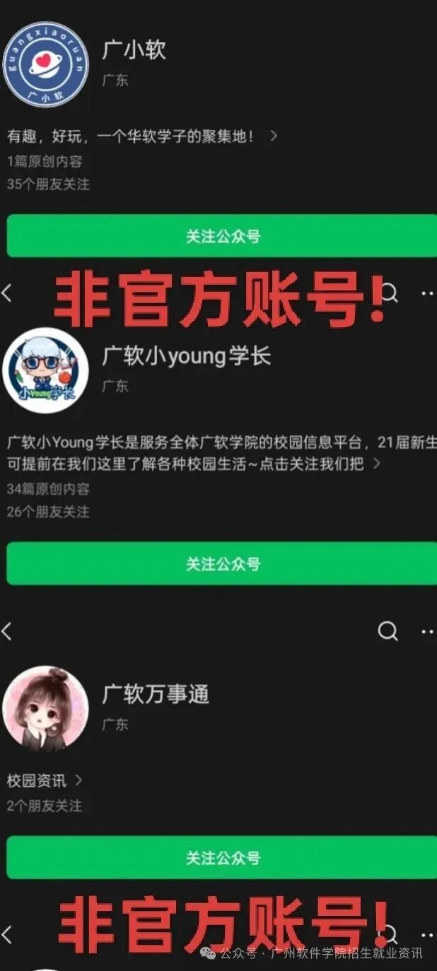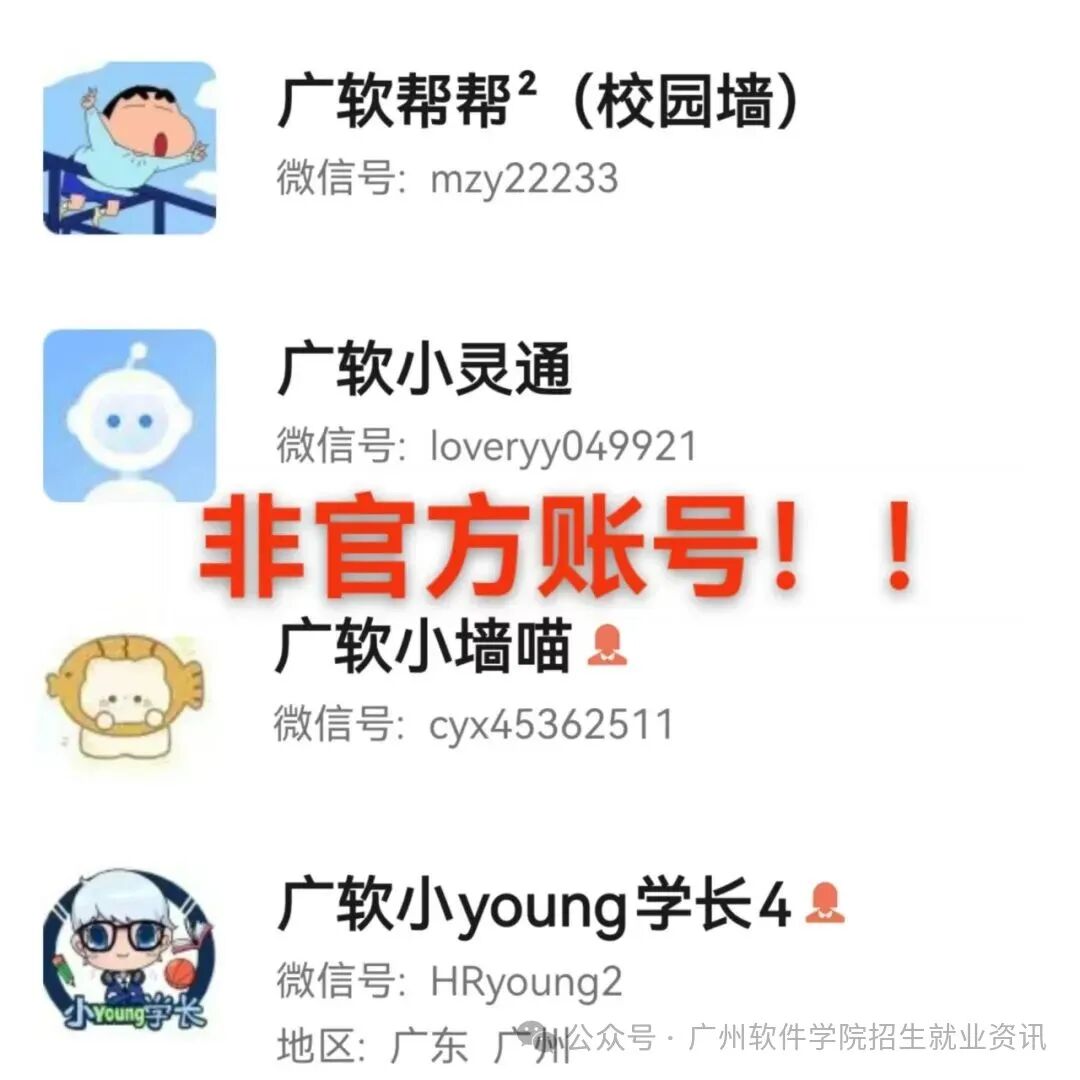 近期,我们发现在微信、QQ、抖音、小红书等社交媒体平台出现多个以“广州软件学院XXX”“广州软件学院X老师”“广软X老师”“广软XX”等命名的非官方账号,以及“广州软件学院新生交流群”等群组。上述账号/群组未经学校授权,擅自使用“广州软件学院”校名(包括但不限于中英文全称、简称)、校徽等官方标识作为头像、名称误导关注,或假借学校、学院部门名义发布各类校园资讯及通知信息,或伪装成学长学姐,用虚假通知、内部信息、“一手”资料、兼职交友、赠送文创礼品等形式“引流”,推销手机卡等商品“圈钱”,甚至套取个人资料信息,给大家的安全埋雷。
