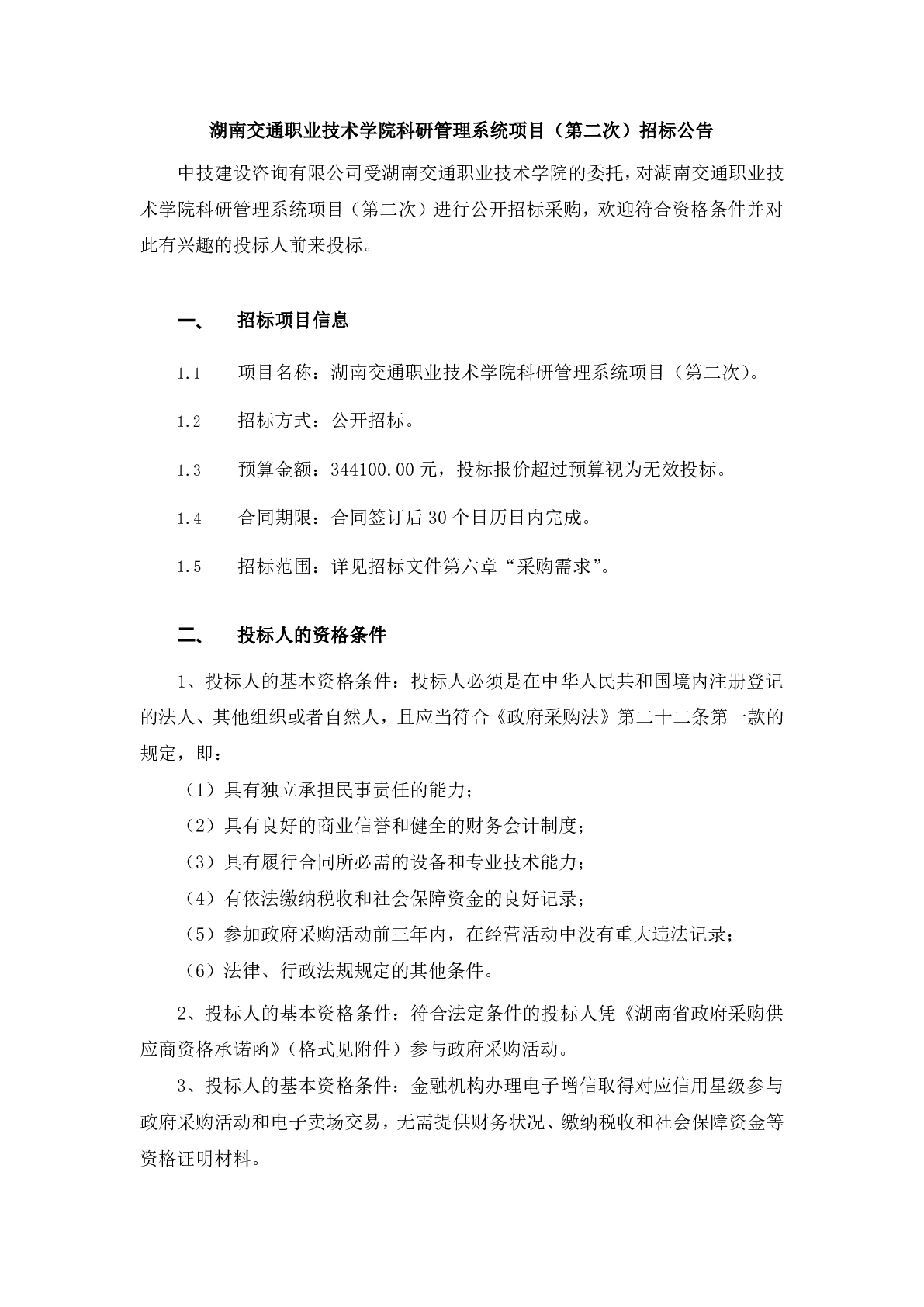湖南交通职业技术学院科研管理系统项目(第二次)招标公告