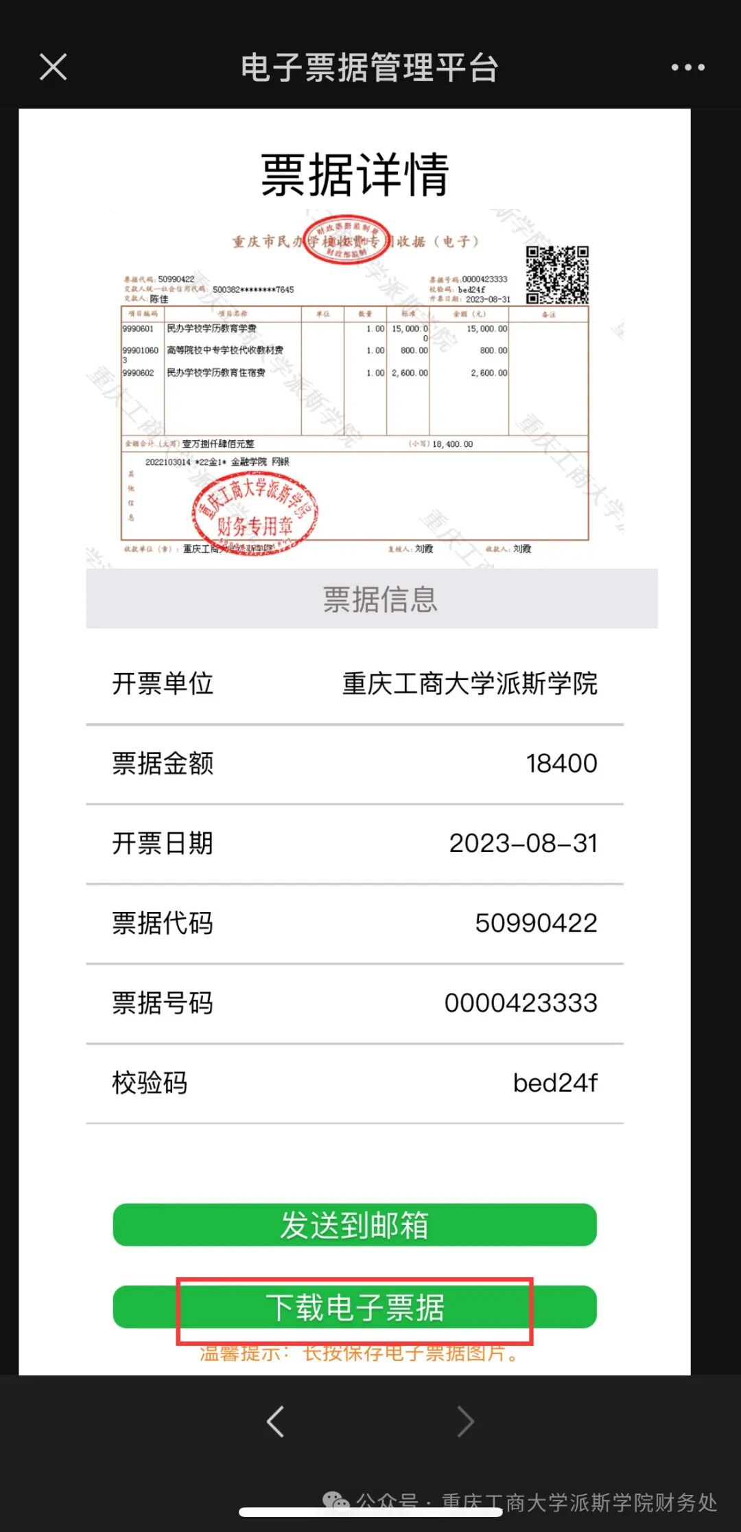 3、电子发票一般在缴费成功之后的1个工作日之内可以获取到,缴费完成之后可以耐心等待,如1个工作日之后仍然无法获取,请联系学校财务处刘老师,联系电话:023-42414641。