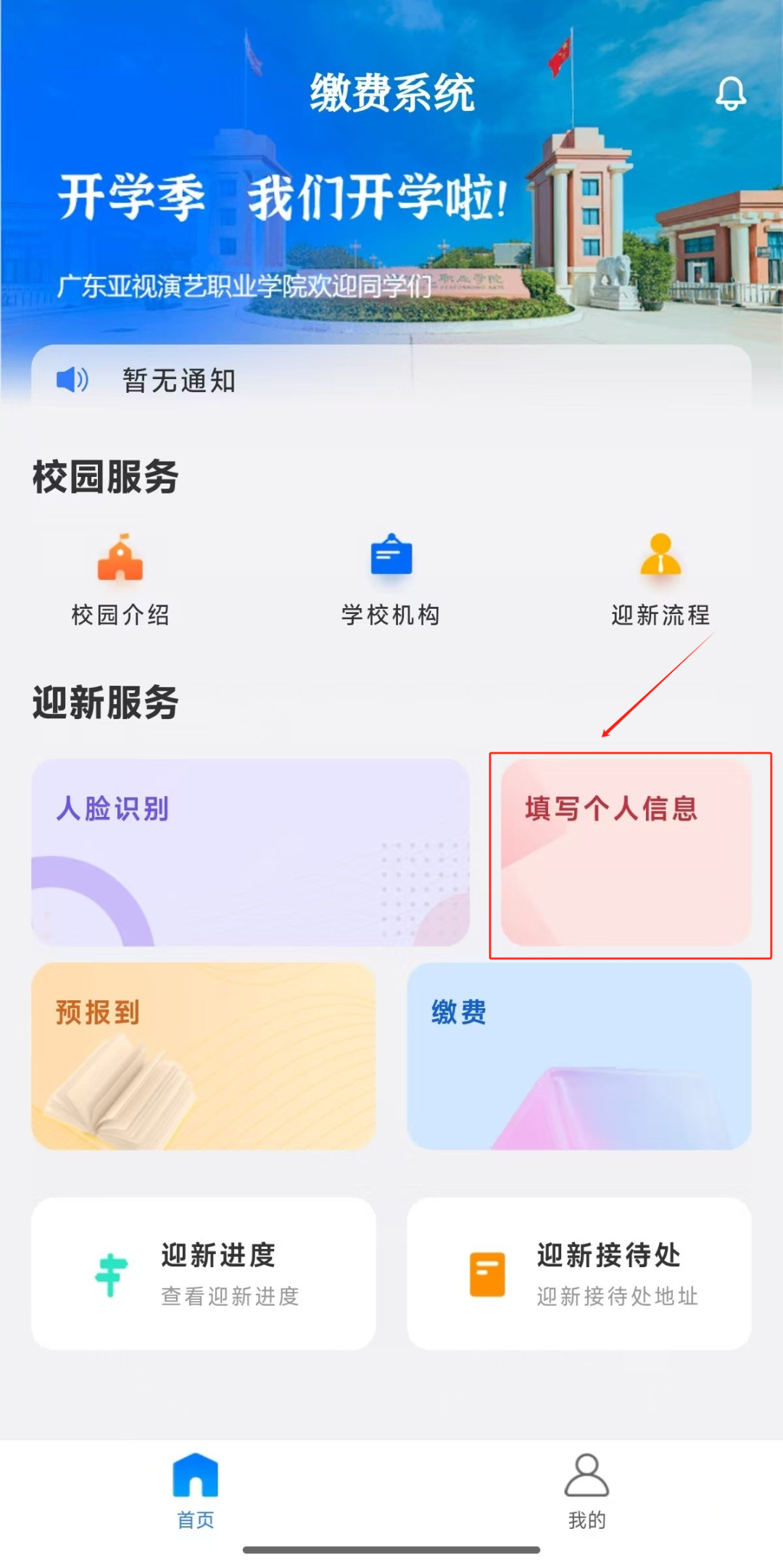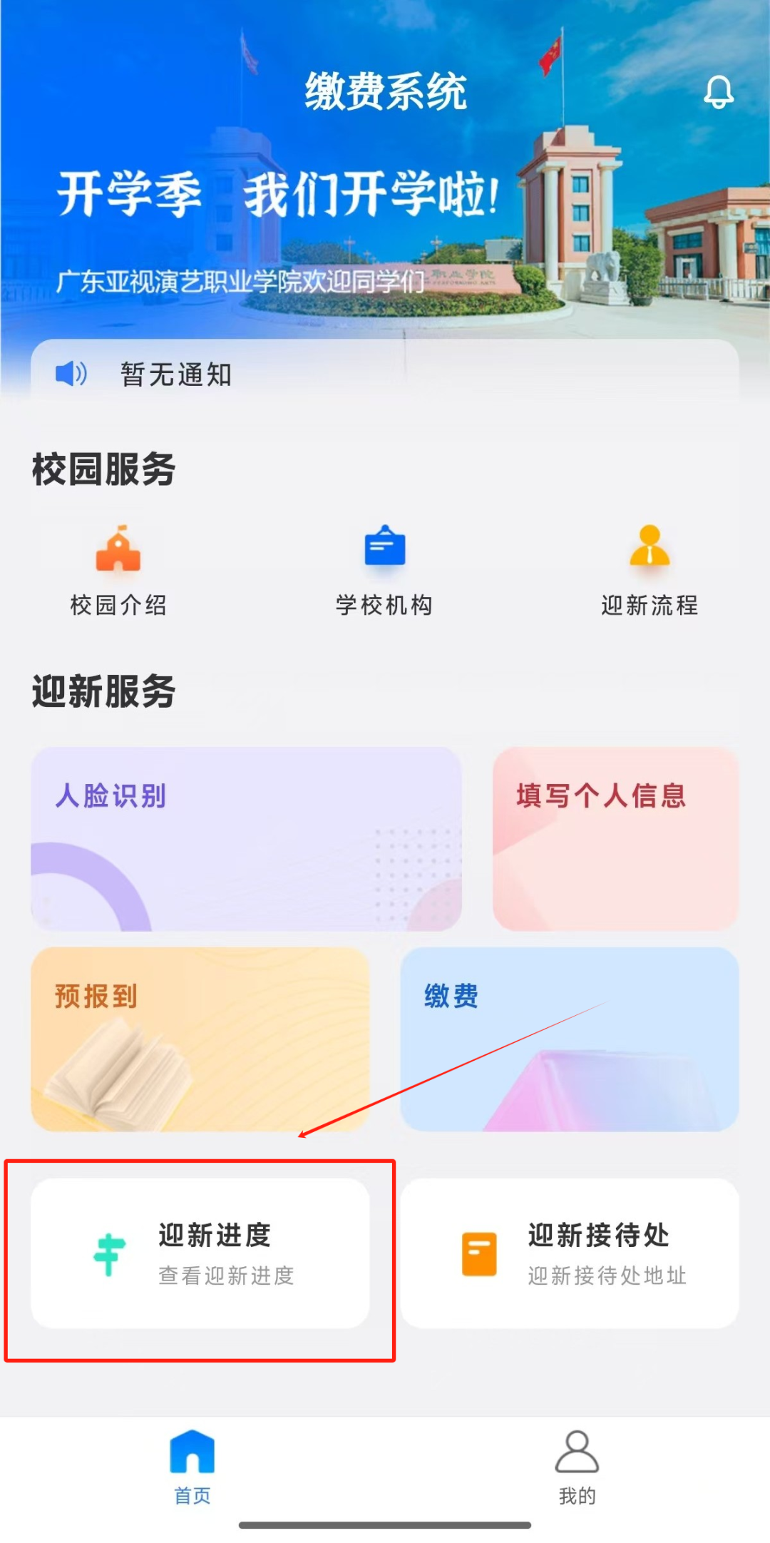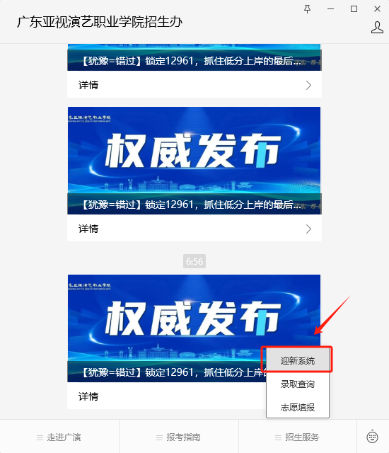 同学们可在“广东亚视演艺职业学院招生办”微信公众号上,选择“招生服务”中的“迎新系统”。