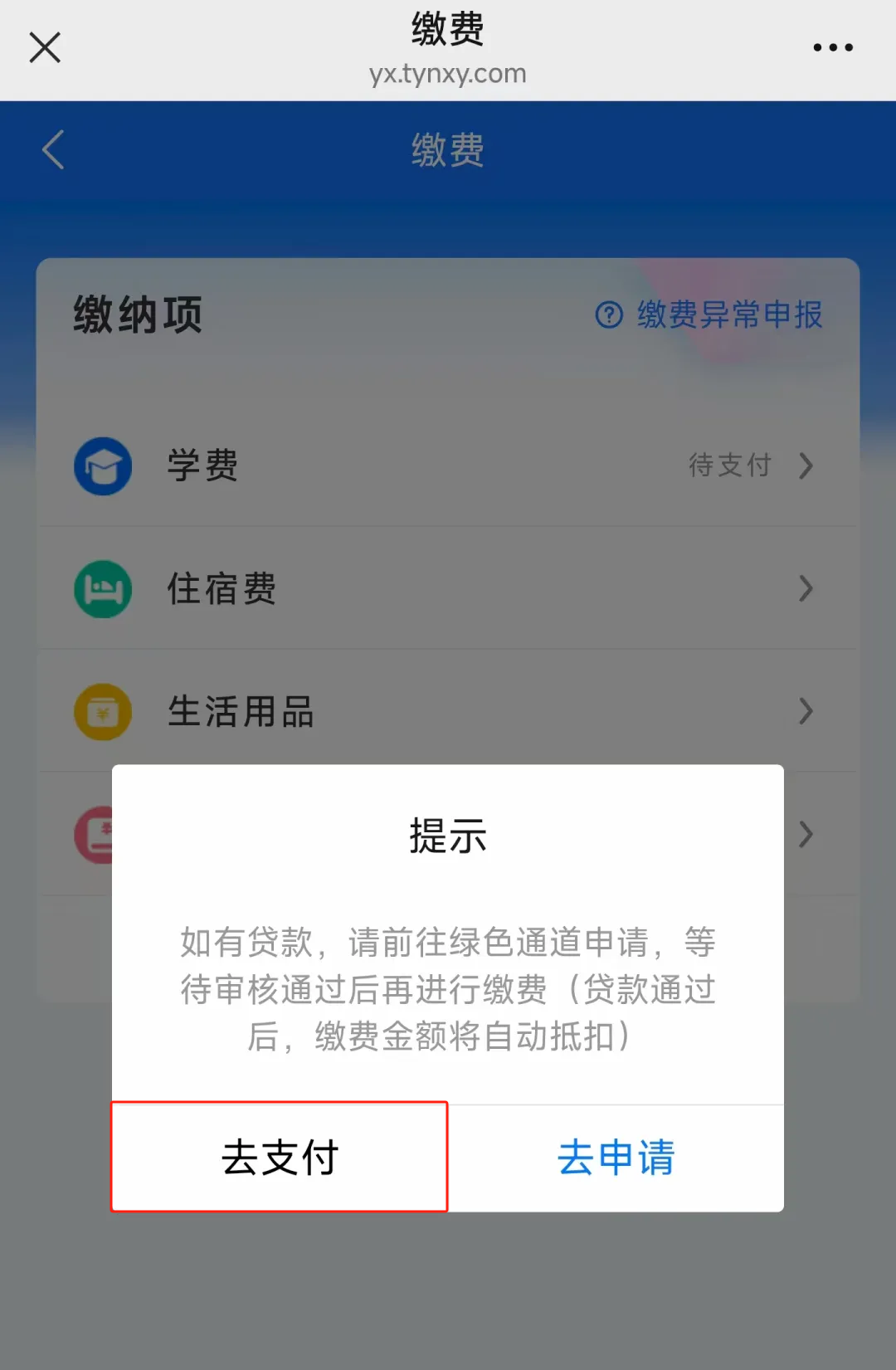 4.如果无需贷款,则在是否有贷款申请的提示中点击【去支付】进入学费支付界面