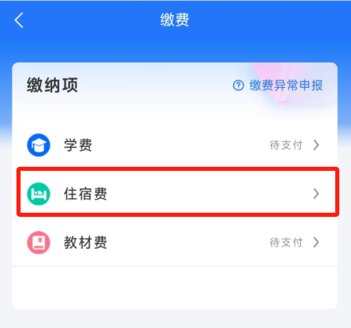 1.缴费完成后可以就开始宿舍选择和住宿费缴纳,点击【住宿费】