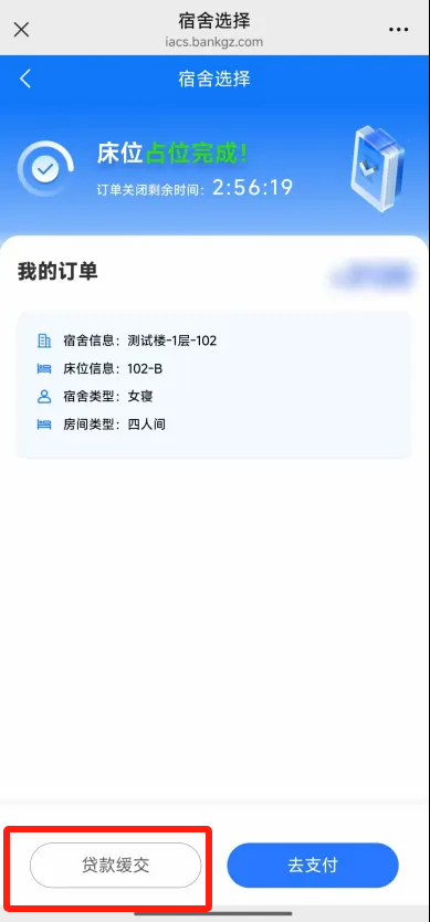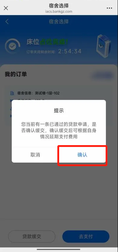 3.完成贷款申请的学生可以点击【贷款缓交】,延期支付费用,在弹出的提示框中点击【确认】即可完成缓交