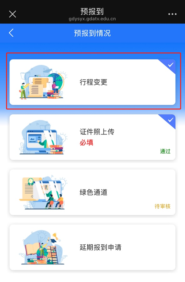2.点击【预报到信息填写】根据个人情况填写调查问卷,第一次提交预报到情况后,预报到信息按钮转变为【行程变更】按钮,可以修改问卷信息。