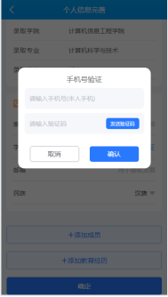 2.输入手机号码,获取验证码并填写,之后点击【确认】完成手机号码验证,根据要求填写家长联系方式和邮箱,并添加至少一位家庭成员和一段教育经历,最后点击【确定】完成个人信息填写