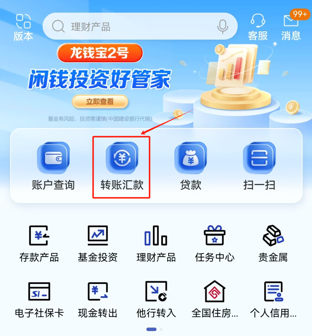 步骤1:打开手机银行,点击“转账汇款”。