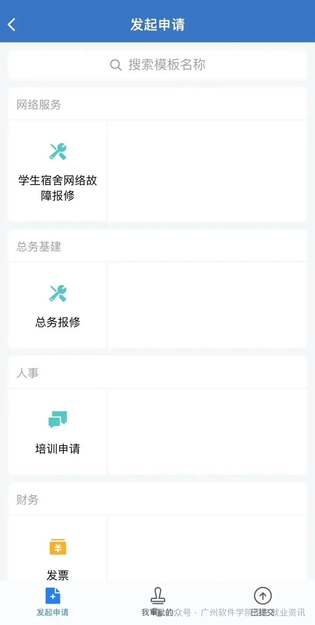 学生登入学校企业微信后能访问广软办事大厅移动端,进行广软办事大厅内的相关业务,同时总务报修、宿舍网络故障报修、班级群通知等应用均可在企业微信中打开。
