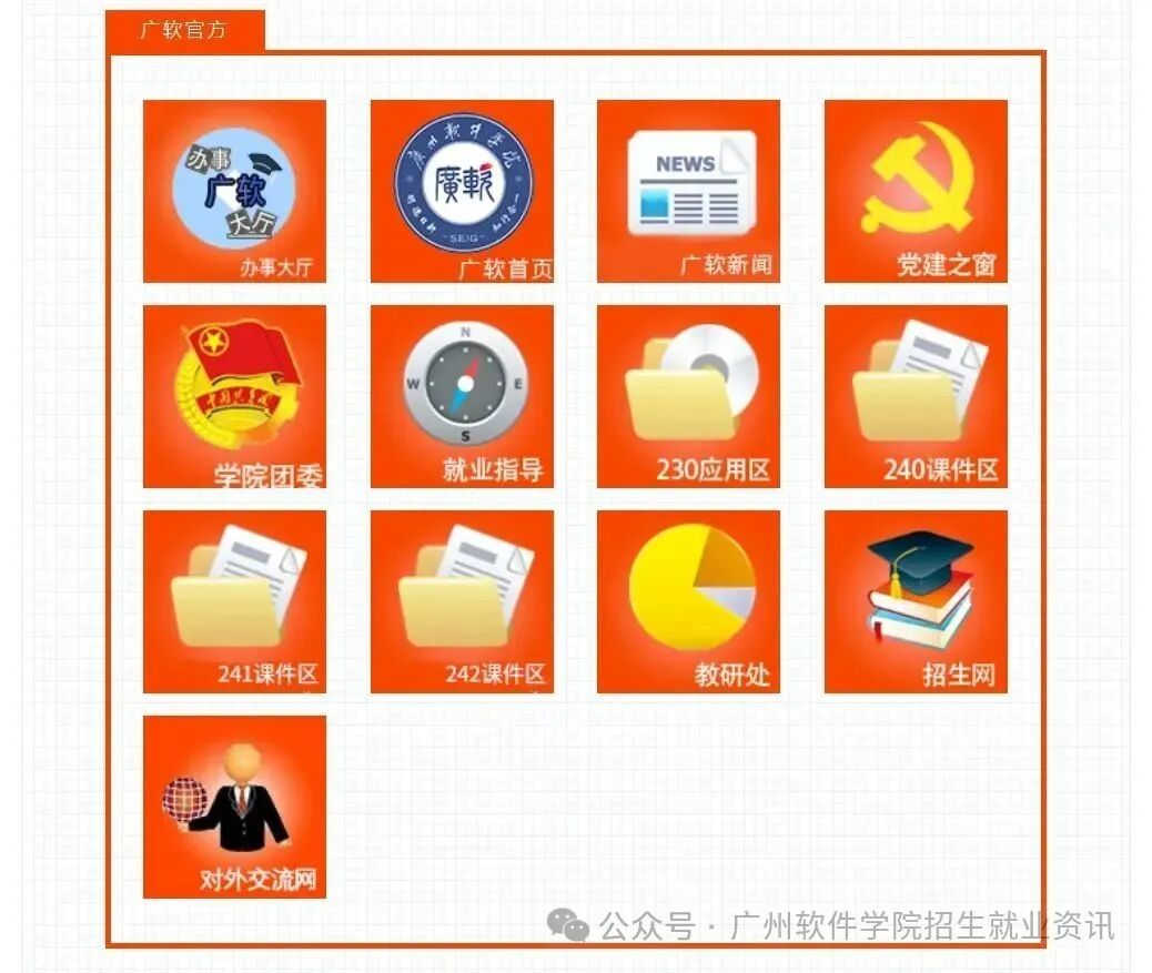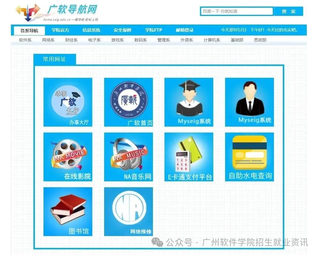 收录了广软常用的网址,一网导航,方便查找。该网页可以进入“办事大厅”“学校FTP”等平台。
