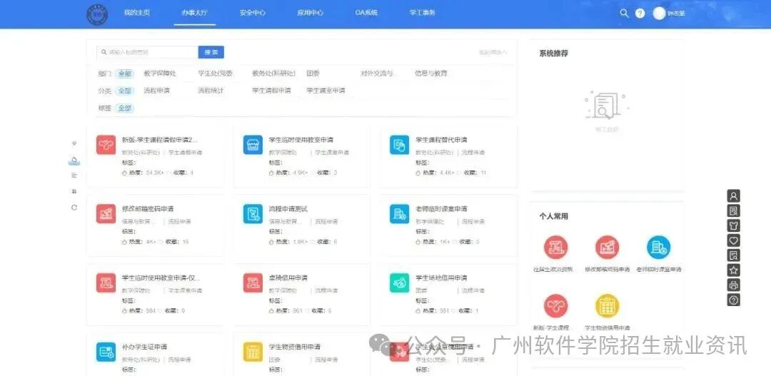 新生经统一身份认证后,能通过办事大厅登录学校各类应用系统。校园学习生活的众多事务(如临时教室申请、活动场地借用、请假、学生证补办、课程代替和修改密码等)都可在网上办理。