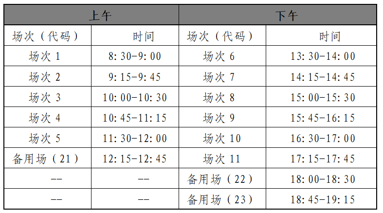 英语四级口语考试(CET-SET4)考试时间为11月22日(F253次),英语六级口语考试(CET-SET6)考试时间为11月23日(S254次),具体场次安排如下: