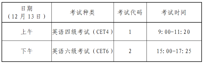 笔试考试时间:12月13日,开考科目为英语四级和六级。