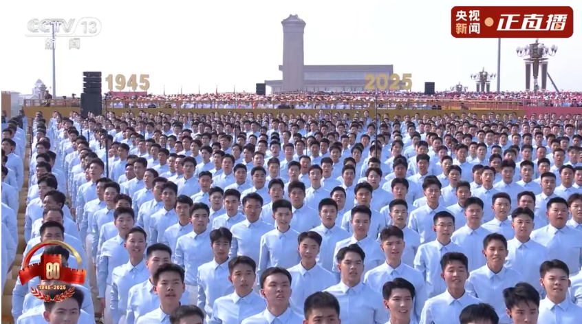 9月3日,在纪念大会上,阅兵开始前,约3000名高校学生组成的合唱团演唱暖场歌曲,点燃了现场观众的情绪。他们身上穿着的演出服装既有律动感,又沉稳大气。这背后,是