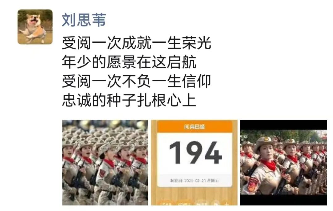 2025年2月,刘思苇经我校推荐,于3月份代表慈溪市参加九三阅兵集训选拔,经过宁波市、浙江省等层层集训考核,凭借自身的坚毅与努力,成功脱颖而出,成为宁波市高校学生中唯一一名参加本次阅兵全女兵方队的女民兵!