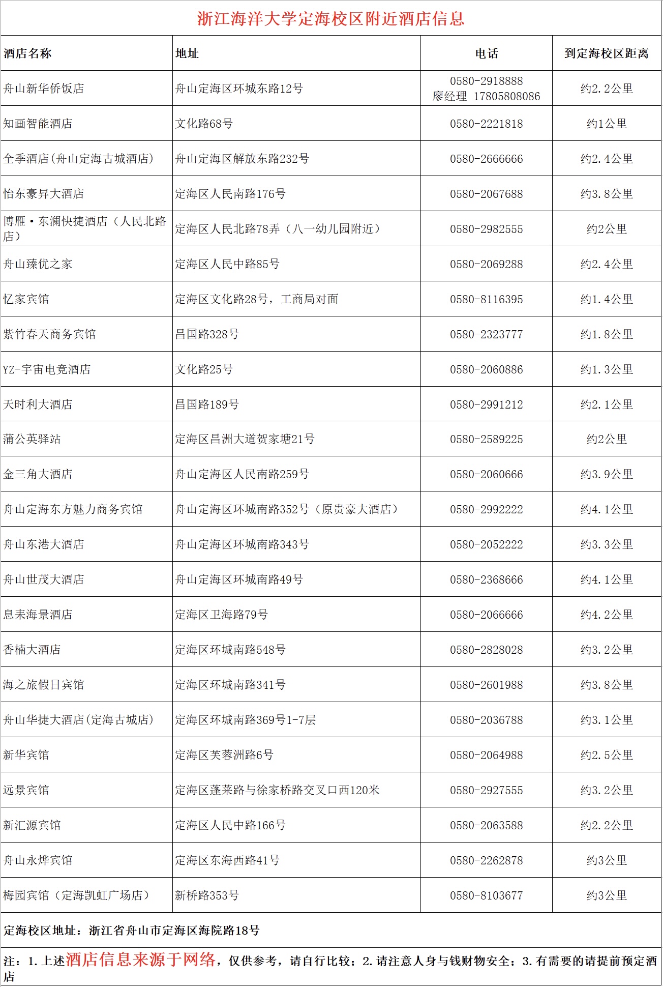 浙江海洋大学定海校区附近酒店信息一览表(供参考)