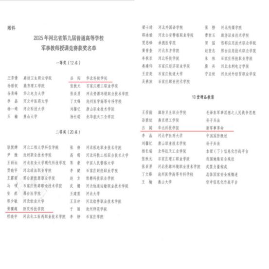 此次授课竞赛由河北省教育厅、河北省军区战备建设局联合举办,全省近百名教师参加比赛。参赛选手从中国国防、国家安全、军事思想、现代战争、信息化装备五个主题中,随机抽取一个主题进行授课,专家评委现场打分,共评选出一等奖12名,二等奖20名,三等奖28名,优秀奖35名,精品教案奖10名。