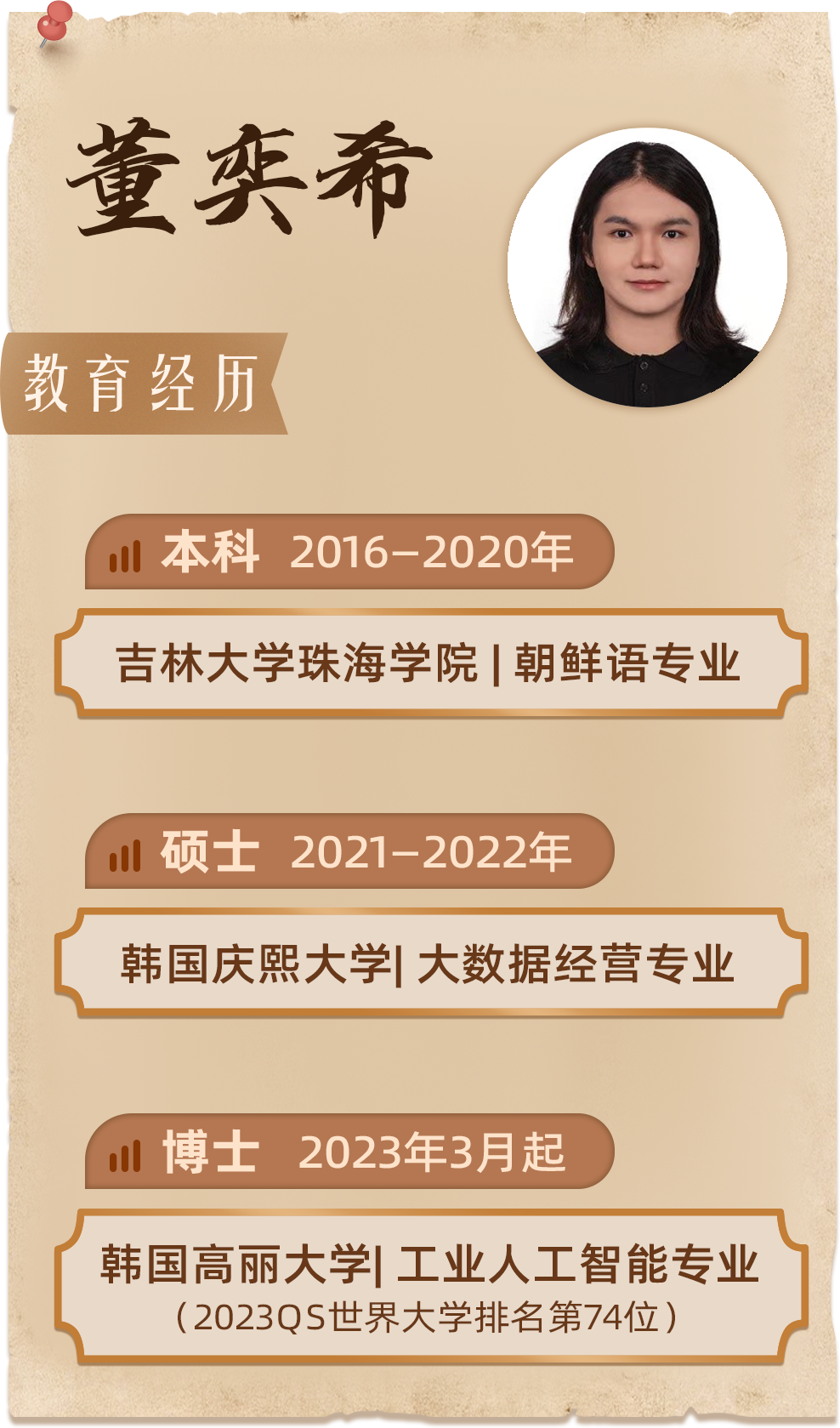 本科阶段我就读的专业是朝鲜语,在前两年甚至更多的时间内,我对于自己的未来并没有设定很清晰的目标。但大四时我突然觉得,我应该要通过提升学历等方式,让自己更有能力去照顾好家人,于是便决定了要攻读硕士,申请了韩国庆熙大学的硕士课程。后来由于疫情原因,就业难度进一步加大,我意识到如果自身不具备能力进入一些有壁垒的行业并获得初始竞争优势,那我也很难实现照顾好家人的目标,于是便选择了继续读博,即将于今年3月入读韩国高丽大学。