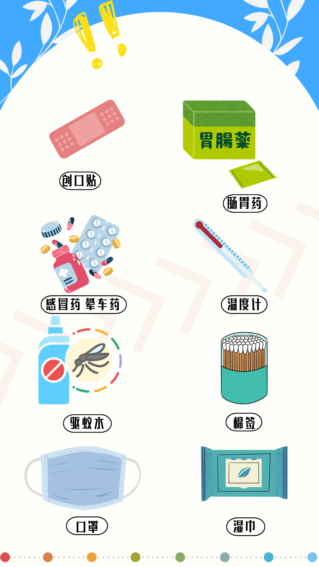 06创口贴、酒精、碘伏、驱蚊水、肠胃药、晕车药、感冒药、体温计、口罩、棉签等