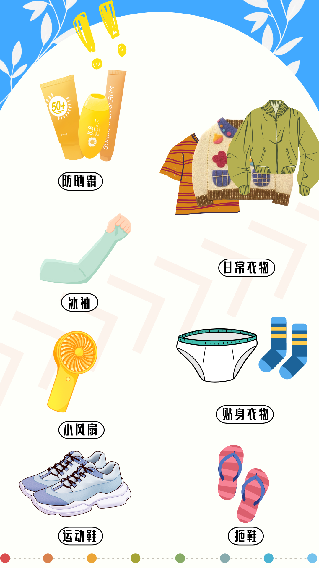 05防晒霜、鞋垫、皮筋、冰凉贴、冰袖、小风扇、藿香正气水等