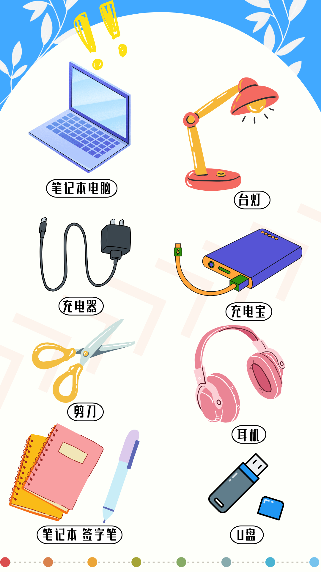 签字笔、铅笔、荧光笔、工具书、剪刀、笔记本、文件夹、台灯等