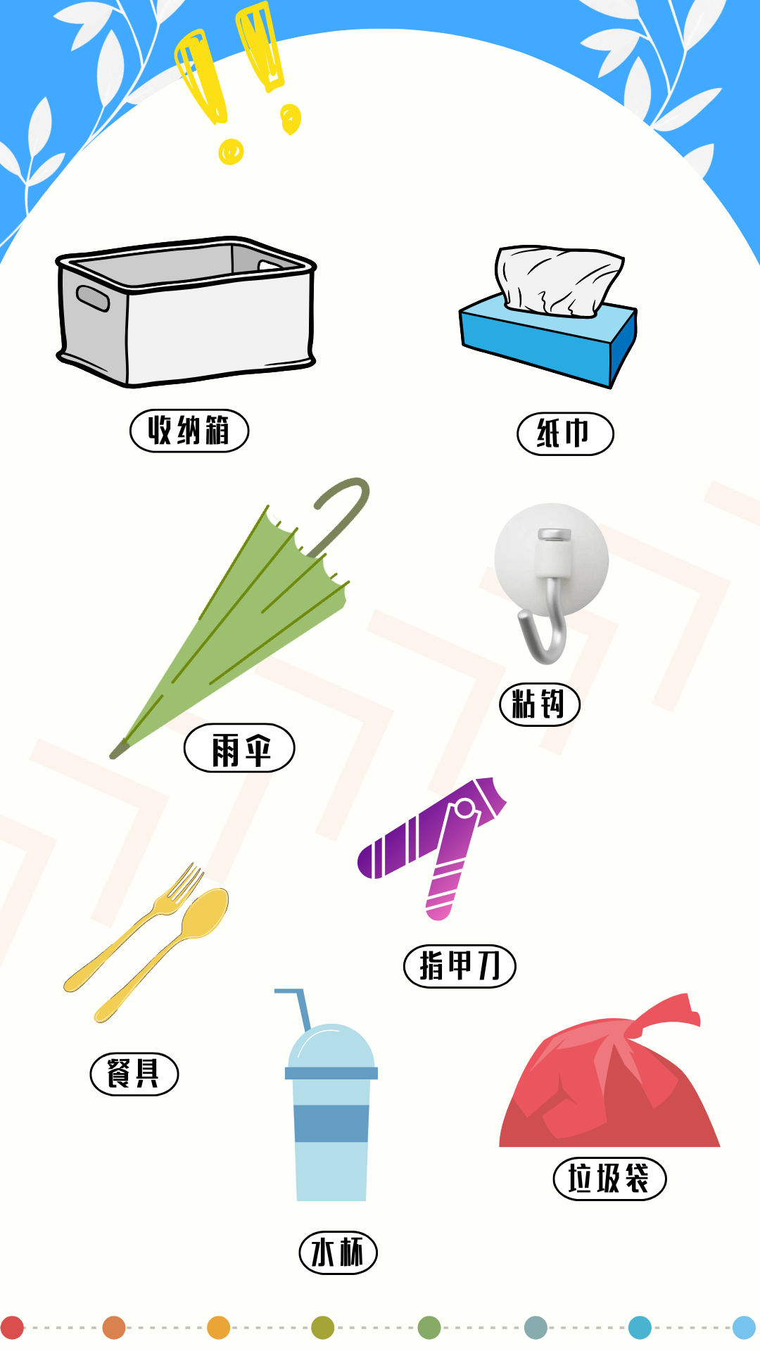 01收纳盒、粘钩、收纳袋、垃圾袋、水杯、纸巾湿巾、雨伞、插排、衣架、指甲刀、小剪刀等