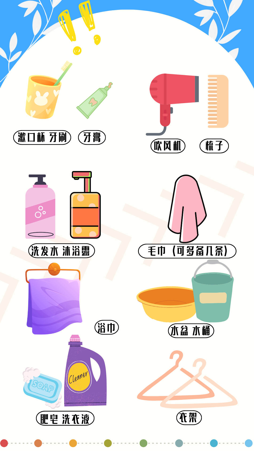 03牙膏、牙刷、洗面奶、洗脸巾、浴巾、洗发水、沐浴露、脸盆、梳子、吹风机等