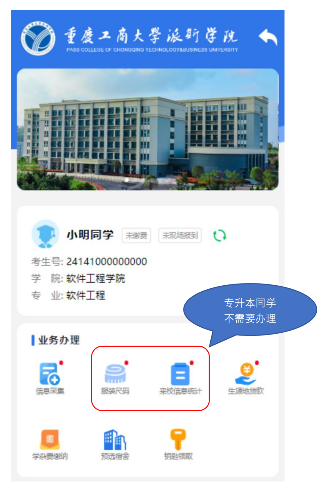 ⚠️专升本新生无需办理【服装尺码】和【来校信息统计】模块