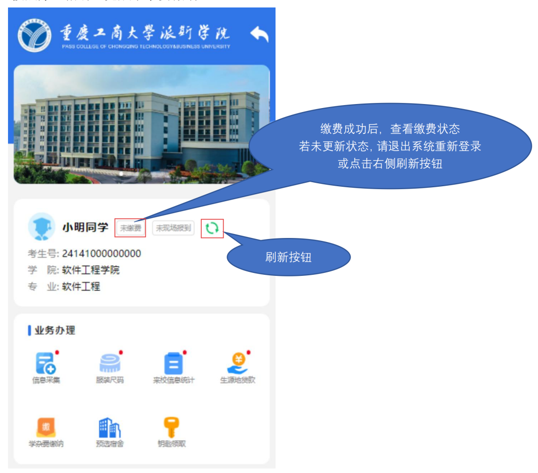 ⚠️缴费成功后,查看缴费状态。若未更新状态,请退出系统重新登录或点击右侧【刷新】按钮。